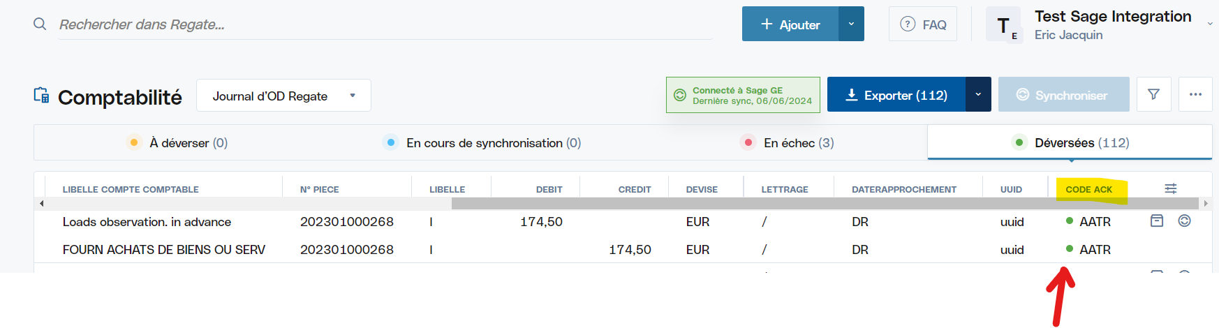 <aside> ℹ️ Qu'est-ce que l'ACK Code ? Il s'agit d'un identifiant unique d'écriture généré avant chaque synchronisation qui est utilisé pour faciliter la réconciliation des données entre Regate et les logiciels comptables.